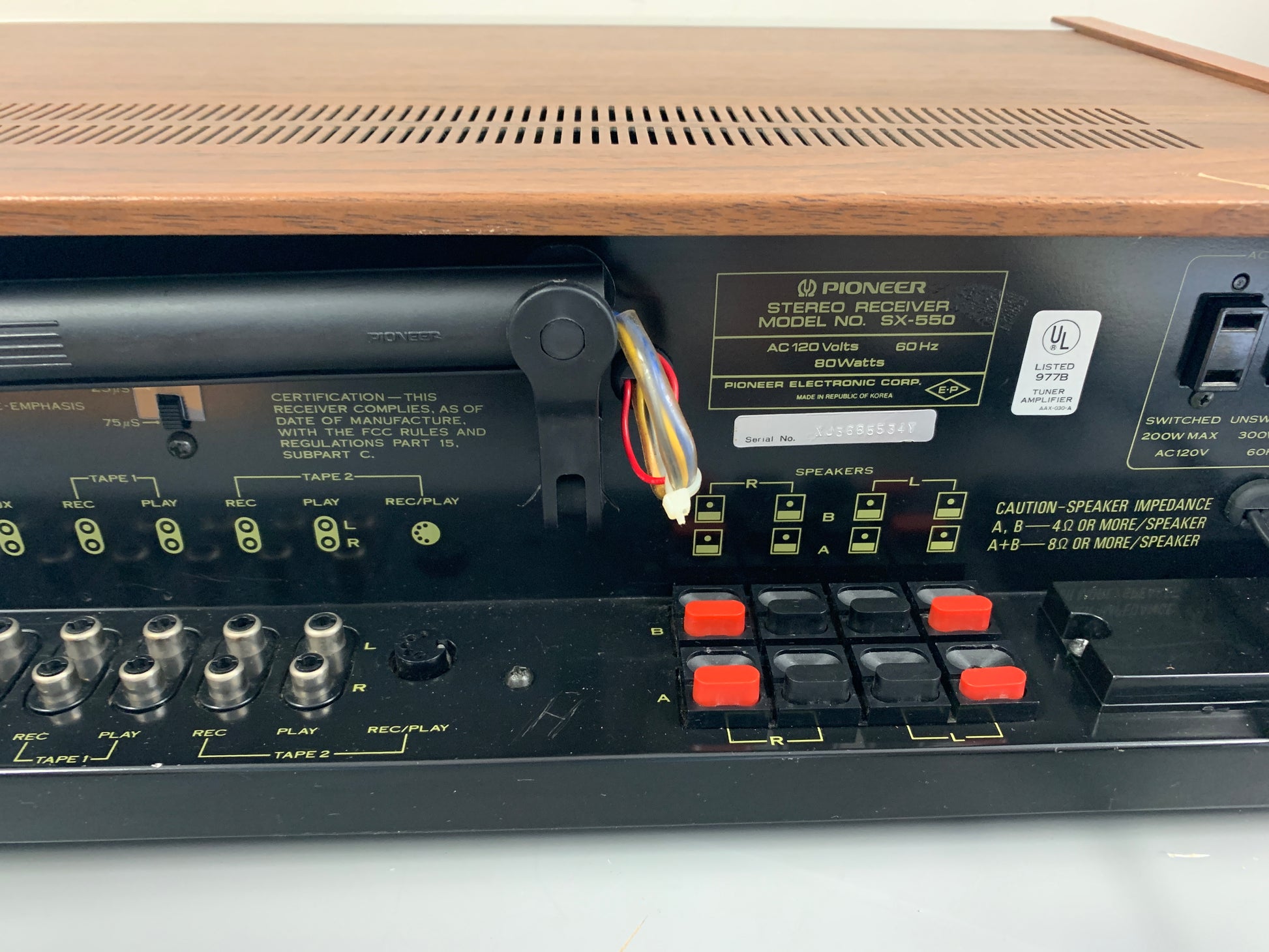 The Pioneer SX-550 is a 20 watt AM/FM stereo receiver featuring FM muting, two tape monitors and provision for 2 pairs of speakers.