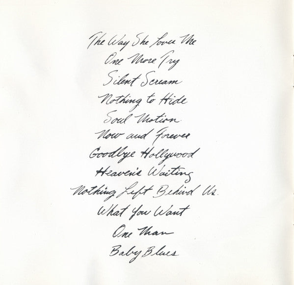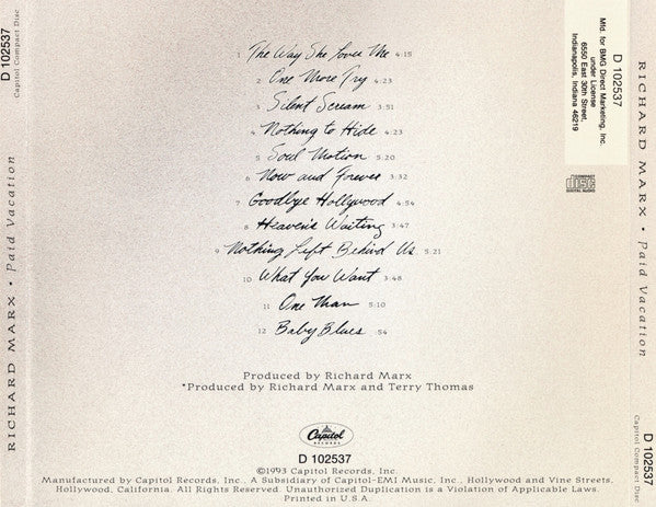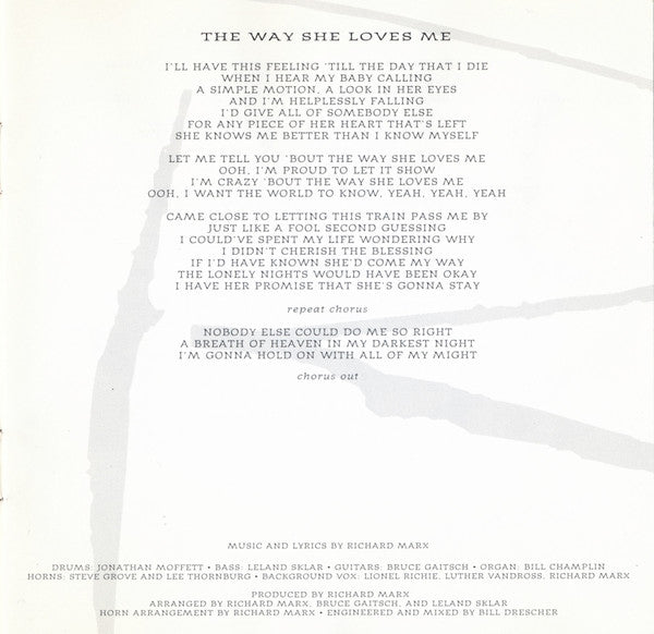 (P) © 1993 Capitol Records, Inc. Manufactured by Capitol Records, Inc. Printed in U.S.A. Mastered at Capitol Studios. All songs copyright ©1993 by Chi-Boy Music (ASCAP) Note from Richard Marx: "To me, there was no better drummer than Jeff Porcaro. His musicianship and kindness to me will never be forgotten. Our loss in heaven's gain."