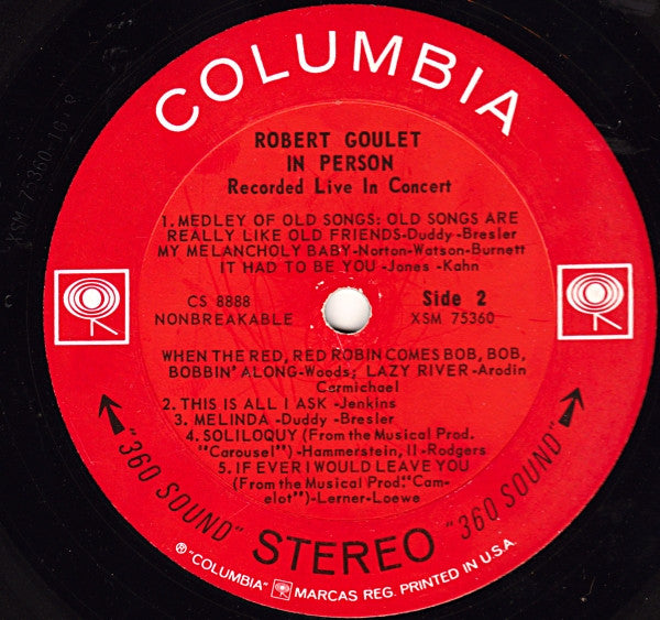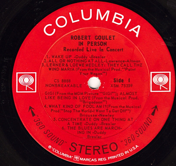 Stereo "360 Sound" Recorded live at the Chicago Opera House. Side I - 19:51 Side II - 20:00 A3a: From the Musical Production "Paint Your Wagon" A3b: From the M-G-M Picture "Gigi" A3c: From the Musical Production "Brigadoon" A4: From the Musical Production "Stop The World—I Want To Get Off" B4: From the Musical Production "Carousel" B5: From the Musical Production "Camelot" © Columbia Records 1963 Released in Mono as CL 2088