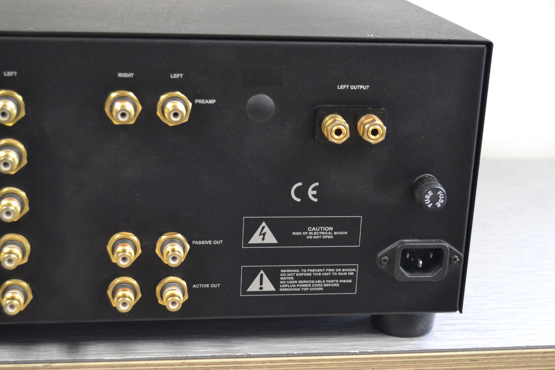After the toggle switch comes a column of five sets of connections for your sources. Next to these connections is a second column that contains three pairs of RCA connections. On top is one labeled Preamp, which allows you to connect a separate preamplifier to the Tempest II, which then becomes a power amp. The middle one is labeled Passive Out and the bottom one is an Active Out. The Passive Out is not affected by the volume control and allows you to send a signal to a recording device; on other units this might be labeled Tape Out. The volume control does adjust the level of the Active Out, which can be used with a subwoofer. You also use the Active Out if want to use the Tempest II as your preamp or to biamp your speakers.