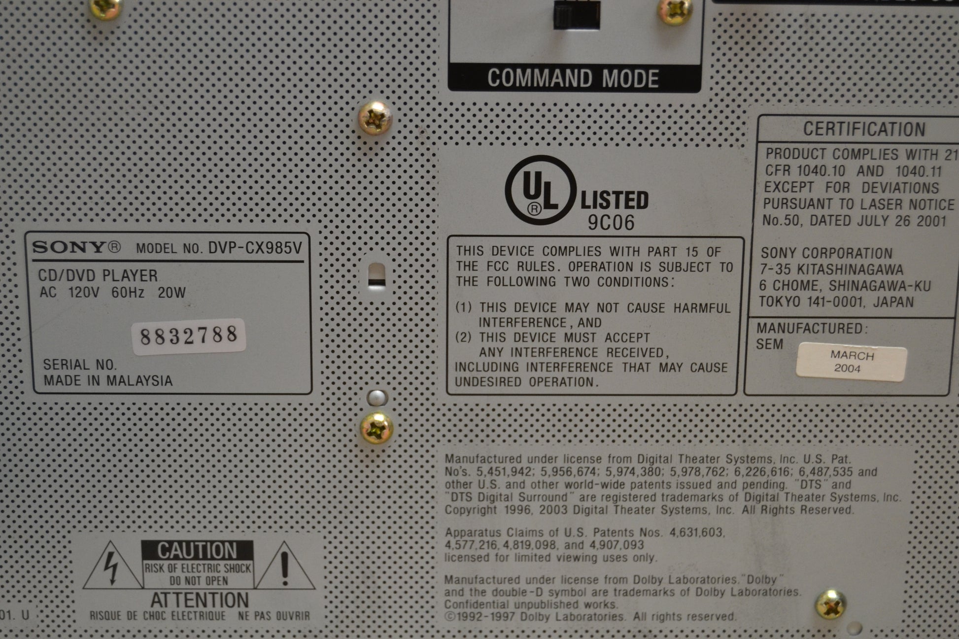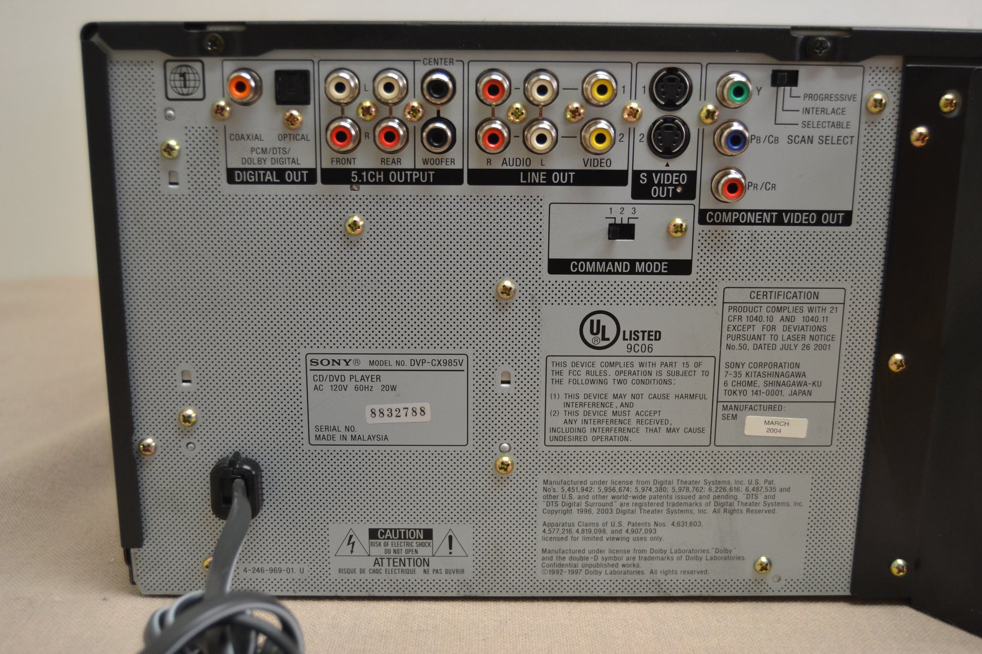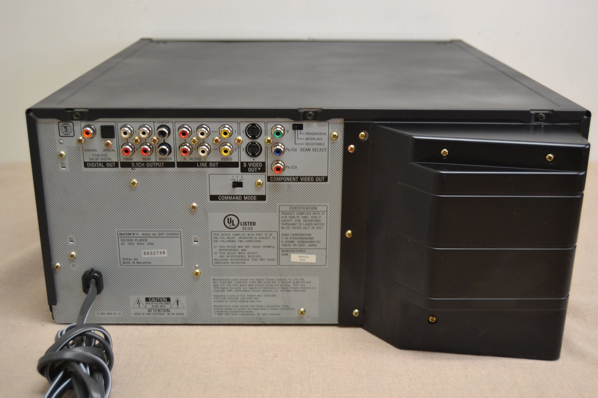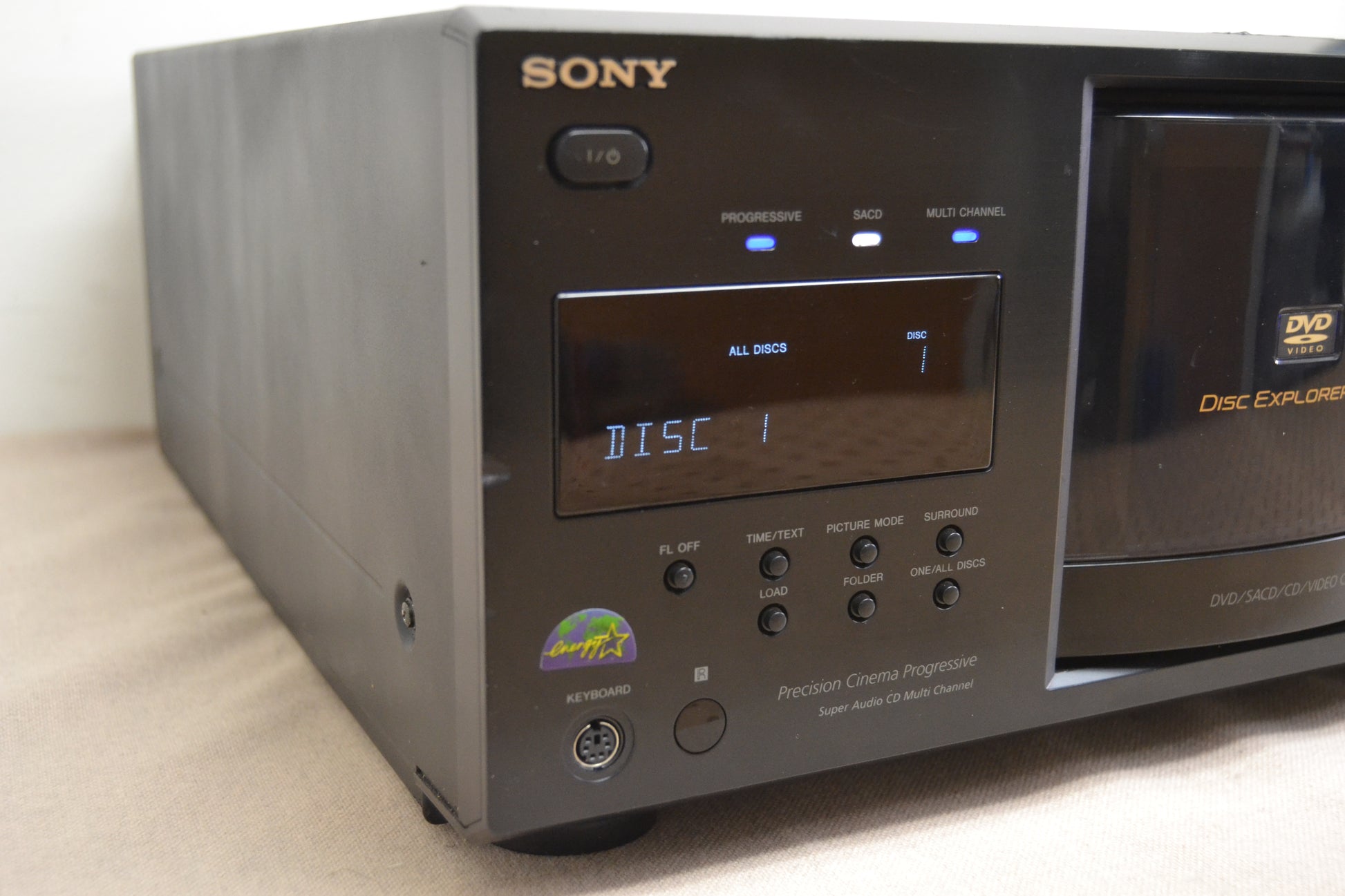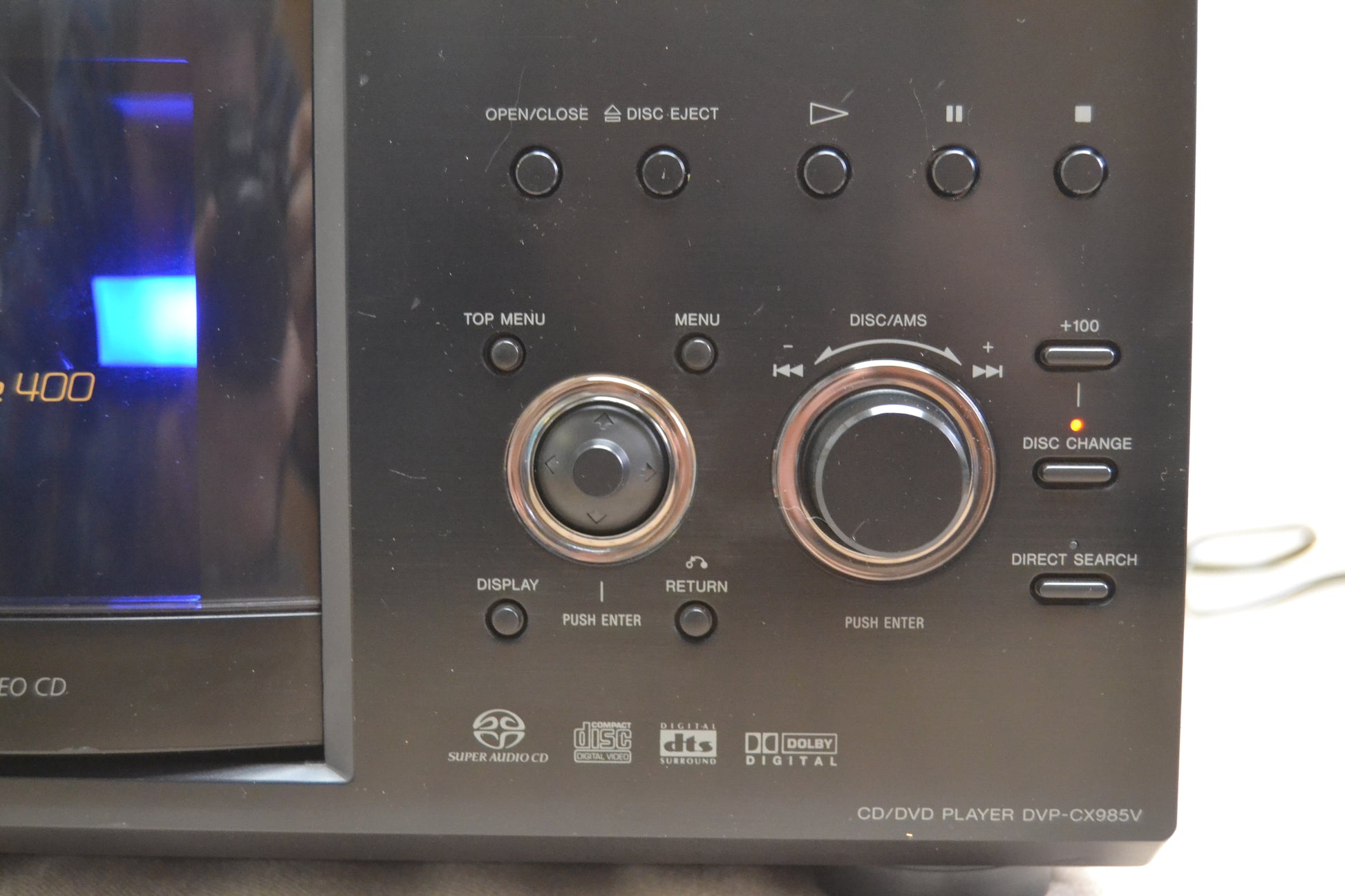 The DVP-CX985V is a terrific multi-purpose addition to any A/V system. It combines top-notch progressive-scan DVD picture quality with the ability to store and organize an entire collection of DVDs and music discs — up to 400 discs total! In addition to regular CDs, the DVP-CX985V plays both stereo and multichannel SACDs (Super Audio CDs) — a new disc format that reproduces music with greater realism. Sony's Disc Explorer™ displays a list of every loaded disc on your TV screen, and lets you access discs either alphabetically by title or by slot number.