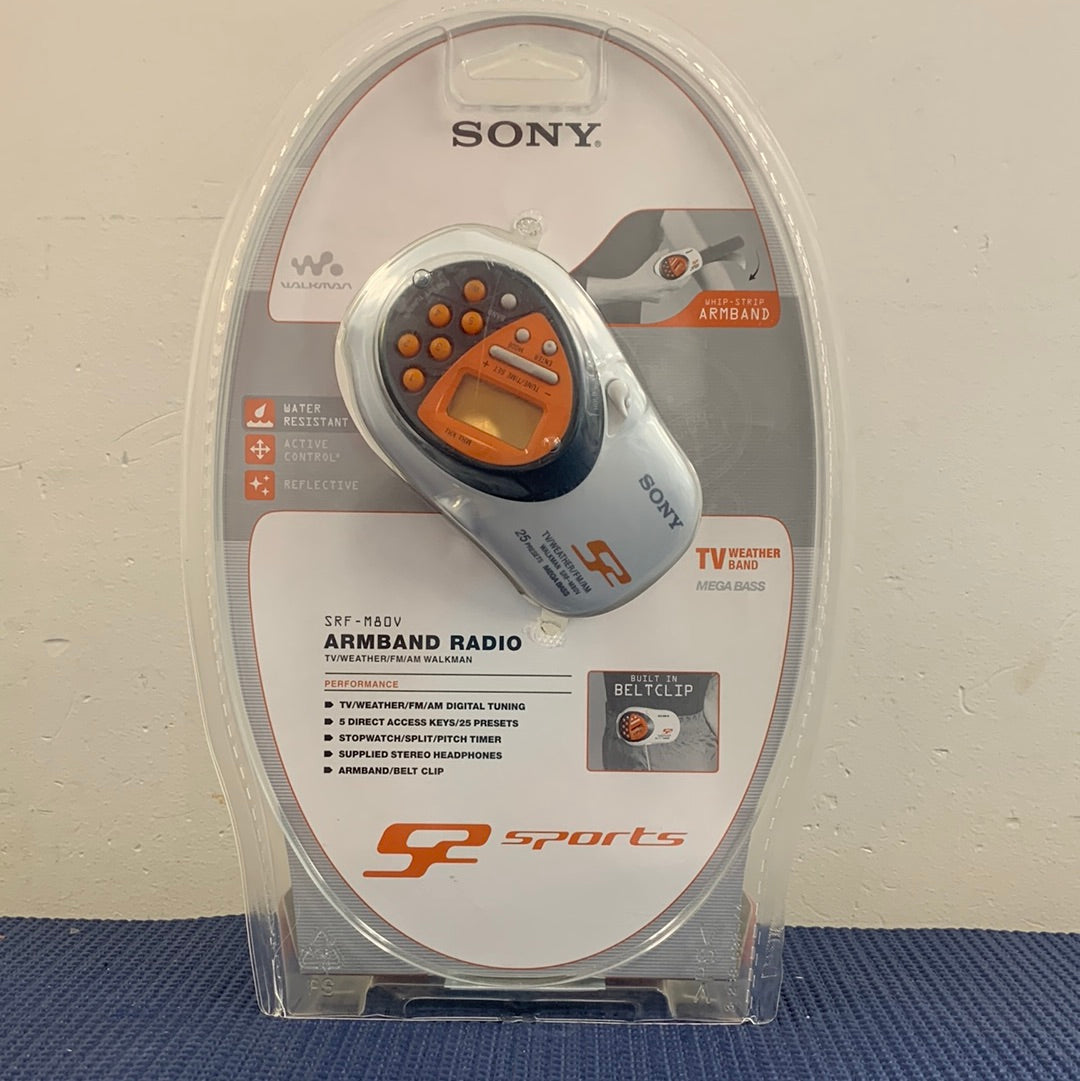 The Sony SRF-M80V Armband is a water-resistant armband radio that offers AM/FM/TV audio and a weatherband with digital tuning. It has 25 presets and a Mega Bass sound system. It also has an angle LCD display that makes it easy to read while moving. The armband and integrated belt clip provide total wearability.