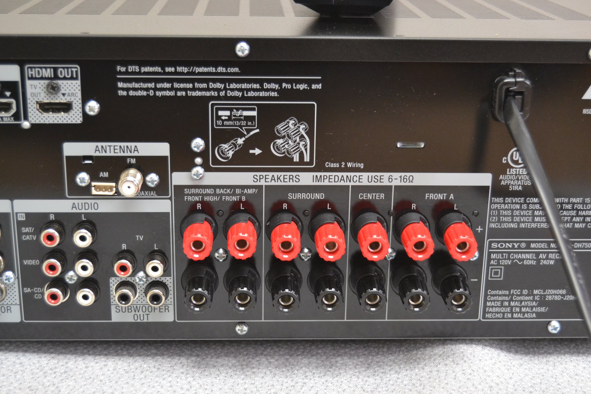 The seven-channel STR-DH750 offers several options for setting up your speakers. Connect seven speakers to enjoy immersive surround sound, either using the sixth and seventh channels as Surround Back or Front High speakers. Or, you can use those channels to power a second set of "B" speakers in an adjoining room, to spread out your music listening to the kitchen or dining room. Or, you can bi-amp your compatible front speakers for fuller, more detailed sound — perfect for stereo music listening. It's all a snap to configure using this receiver's on-screen guide and Digital Cinema Auto Calibration, which configures your speakers for optimum sound once you have them placed where you want them. Just plug in the included setup microphone and follow the on-screen instructions for sound tailored to your room and speakers.