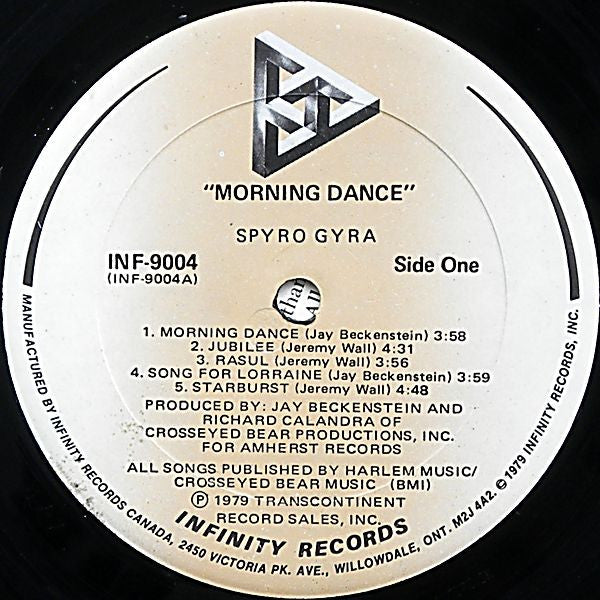 Ⓒ 1979 Infinity Records, Inc. Ⓟ 1979 Transcontinent Record Sales, Inc. Manufactured by Infinity Records Canada. Distributed by MCA Distribution Canada, Willowdale, Ontario. All selections published by Harlem Music / Crosseyed Bear Music (BMI). John Tropea appears courtesy of Marlin Records David Samuels appears courtesy of ECM Records Michael and Randy Brecker appear courtesy of Arista Records Larry Fast appears courtesy of Passport Records, Inc. The inner sleeve is printed with a track and credits-list and is illustrated in black & white. Printed on the spine is: SPC [Shorewood logo Litho In Canada. The runouts are etched; MASTERDISK & ⧈-G-⧈ are stamped; the "S" and "INS" variant 2 are scrached. Cat# INF 9004 on the cover and spine. Cat# INF-9004 on the labels.