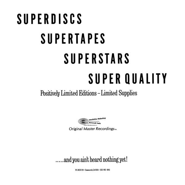 Sleeve : Original Master Recording. To Sam All songs published by Rondor Music (London) Ltd. and Delicate Music Ltd, Controlled in the U.S. and Canada by Almo Music Corp. (ASCAP) Recorded at Trident, Ramport Studios and Scorpio Sound, London between February and June, 1974. Half Speed Master Lacquers by Stan Ricker, JVC Imported High Definition Vinyl Static Free Inner Sleeve Manufactured and distributed by special license from A & M Records, Inc. by the Mobile Fidelity Sound Lab. Labels : Original Master Recording™ All selections published by Almo Music Corp./ Delicate Music (ASCAP) Manufactured and distributed by the Mobile Fidelity Sound Lab under license from A&M Records, Inc. Stereophonic Pressed in Japan. ℗1974 A&M Records, Inc. Inserts : ‘Superdiscs / Supertapes / Superstars / Super Quality’ reads : Positively Limited Editions - Limited Supplies Original Master Recordings™ P.O. Box 919 - Chatsworth, CA 91311 - (213) 993-4945 ‘An Audiophile’s Dream Come True!’ Mobile Fidelity Sound Lab, proprietor of ”Original Master Recording(s)” (trade-mark),... We guarantee not to exceed more than 200,000 copies of any release. The disc cutter turntable is driven at 16⅔ rpm, and the master tape is played at exactly one-half the actual recorded speed. This half-speed disc cutting method allows the cutting stylus twice as much time to carve an accurate groove. Because our entire transfer chain (from tape deck to cutting head) is transformless,... We do not employ limiting or compression. We recently incorporated the Ortofon master disc cutting system... Our plating... Currently, the Victor Co. of Japan (JVC) performs this most arduous task... The Victor Co. of Japan (JVC) is the sole producer of this vinyl and also presses our discs. mobile fidelity sound lab (logo) a division of MFSL, Inc. © 1979 ‘The key high fidelity component quaranteed to improve any stereo system.’ reads : Super Jac Heavy Duty Packaging Super-Fi Super Stars Limited Editions The Catalog Of Hi-Fi Super Stars (June 1979) from MFSL 1-001 to MFSL 1-020 ‘Mastered At’ stands for a ‘Plated At’ role. This company, its pressing role, the record company, the limited edition format and the year of release, are derived from the inserts. Some cardboard inserts, designed to protect the album, had no printing and were completely blank. The LP itself is translucent (hold it up to a bright light and you can see through it).