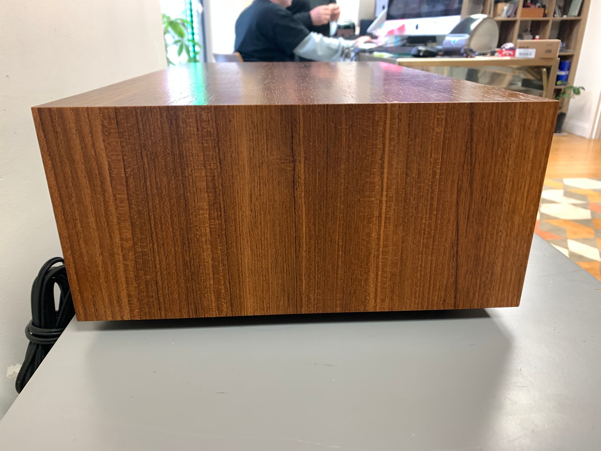 Refinishing the walnut cabinet can transform a unit. We do use real wood oil or Danish oil, not polyurethane. We clean the glass dial carefully; those silkscreened letters are fragile.