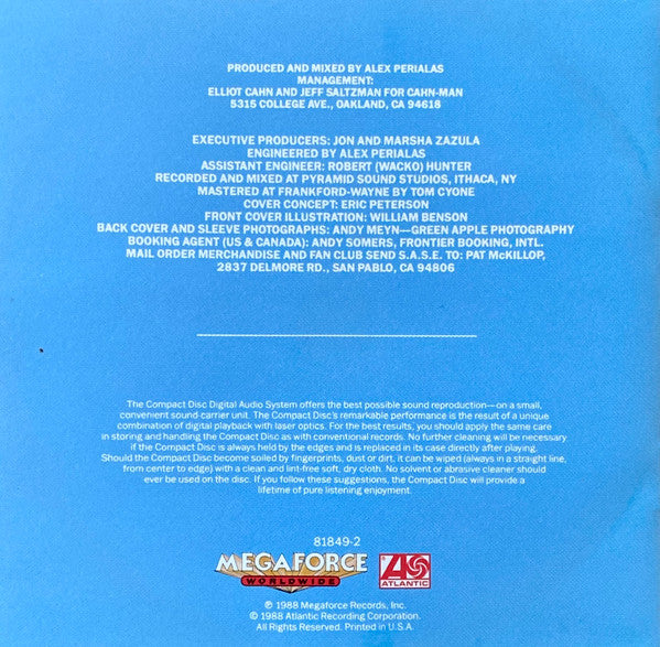 "Disciples Of The Watch" was inspired by the movie "Children Of The Corn" and "Musical Death (A Dirge)" is dedicated to the memory of Letti Csengeri. ℗ 1988 Megaforce Records, Inc. © 1988 Atlantic Recording Corporation Printed in U.S.A.