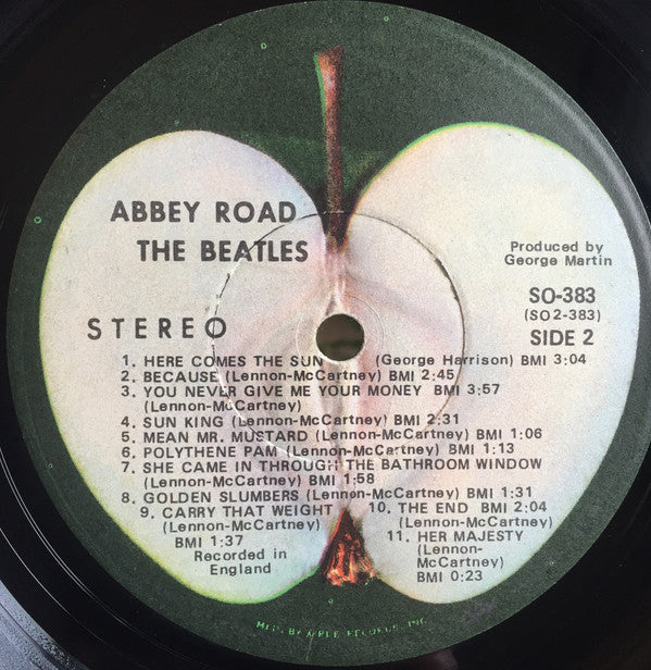 FRONT COVER: Right center crosswalk stripe has a square metal street access lid that bleeds off the bottom of the album cover (it is cropped in later versions). BACK COVER: APPLE SO-383 Track List (Her Majesty listed) Apple Records (with aligned logo) An E.M.I. recording. Thanks to George Martin, Geoff Emerick and Phillip McDonald Photographs by Iain Macmillan LABEL SIDE A: Track List (Left Aligned) "S T E R E O" Produced by George Martin Recorded in England LABEL SIDE B: Track List (Left Aligned) "Her Majesty" listed "S T E R E O" Recorded in England Produced by George Martin MFD. BY APPLE RECORDS, INC.