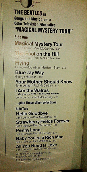 1969-71 Reissue pressing with the green Capitol label with purple "C". Almost identical with [r7908903 but rim text begins and ends below tracklist top, printed sharper with thinner fond, STEREO is stretched so the letters have larger gap. ® symbol is under the "l" in Capitol. -Inside jacket credits all songs to "Maclen Music Inc, BMI", but tracks on the side 1 label are credited to ASCAP. -"No You're Not" text is in a handwritten script font on the inside cover, under "I Am the Walrus". -Issued in a gatefold cover with a 24-page color booklet stapled inside. -Pressed at Capitol's Jacksonville factory, as identified by a "O" stamp in the run-outs. © 1967 NEMS ENTERPRISES LTD (on front cover). © All lyrics copyright 1967 for the world by Northern Songs Ltd. England (Below lyrics inside gatefold.) Spine only says 2835. Label says SMAL-2835 on both sides.