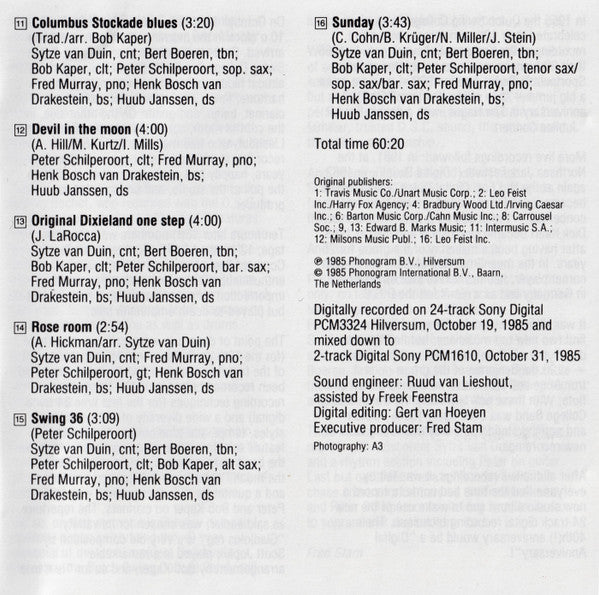 Total playing tiem: 60:20 Digitally recorded on 24 track Sony Digital PCM3324 Hilversum, October 19, 1985 and mixed down to 2 track Digital Sony PCM1610, October 31, 1985. ℗ 1985 Phonogram B.V., Hilversum © 1985 Phonogram International B.V., Baarn, The Netherlands Printed in West Germany Made in West Germany