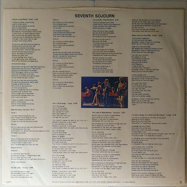 [l737722 pressing denoted by "PH" plant code on labels and "PR." etch in runouts. First issue: white labels with purple logo. Issued with custom lyric / photo inner sleeve. All instruments played by THE MOODY BLUES Recorded at Tollington Park Studios, London ℗ © 1972 Threshold Records Ltd. Distributed by London Records, Inc., 539 West 25th Street, New York, N.Y. 10001