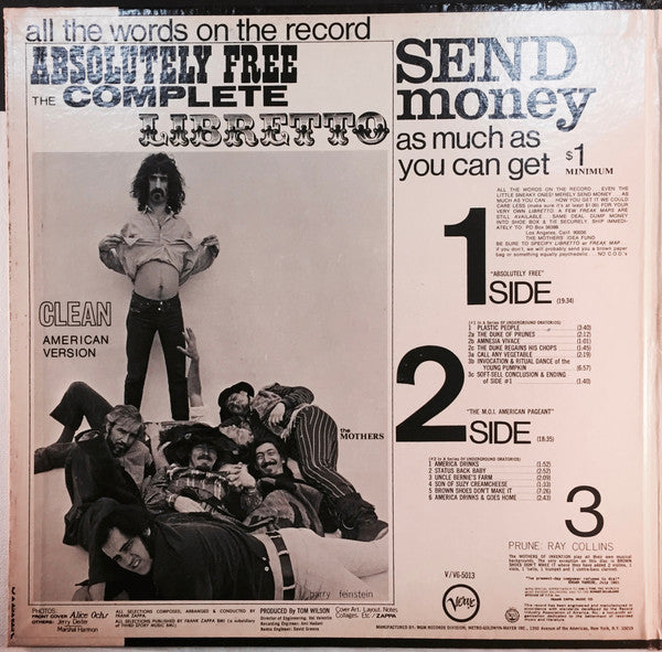 Cat#s: 1st on cover, 2nd on labels. Gatefold cover. "Clean American Version" printed inside-left, with '$1 libretto' offer. Silver text on blue Verve labels with big ''T'' logo. Sides as "Side 1" & "Side 2" Address; "MGM Records - A Division of Metro-Goldwyn-Meyer, Inc - Made in U.S.A." "Frank Zappa Music - BMI. A Division of Third Story Music". Left of Zappa's head the title appears on the cover. Back cover printed upside down as a continuation of the front cover, No printing on spine.