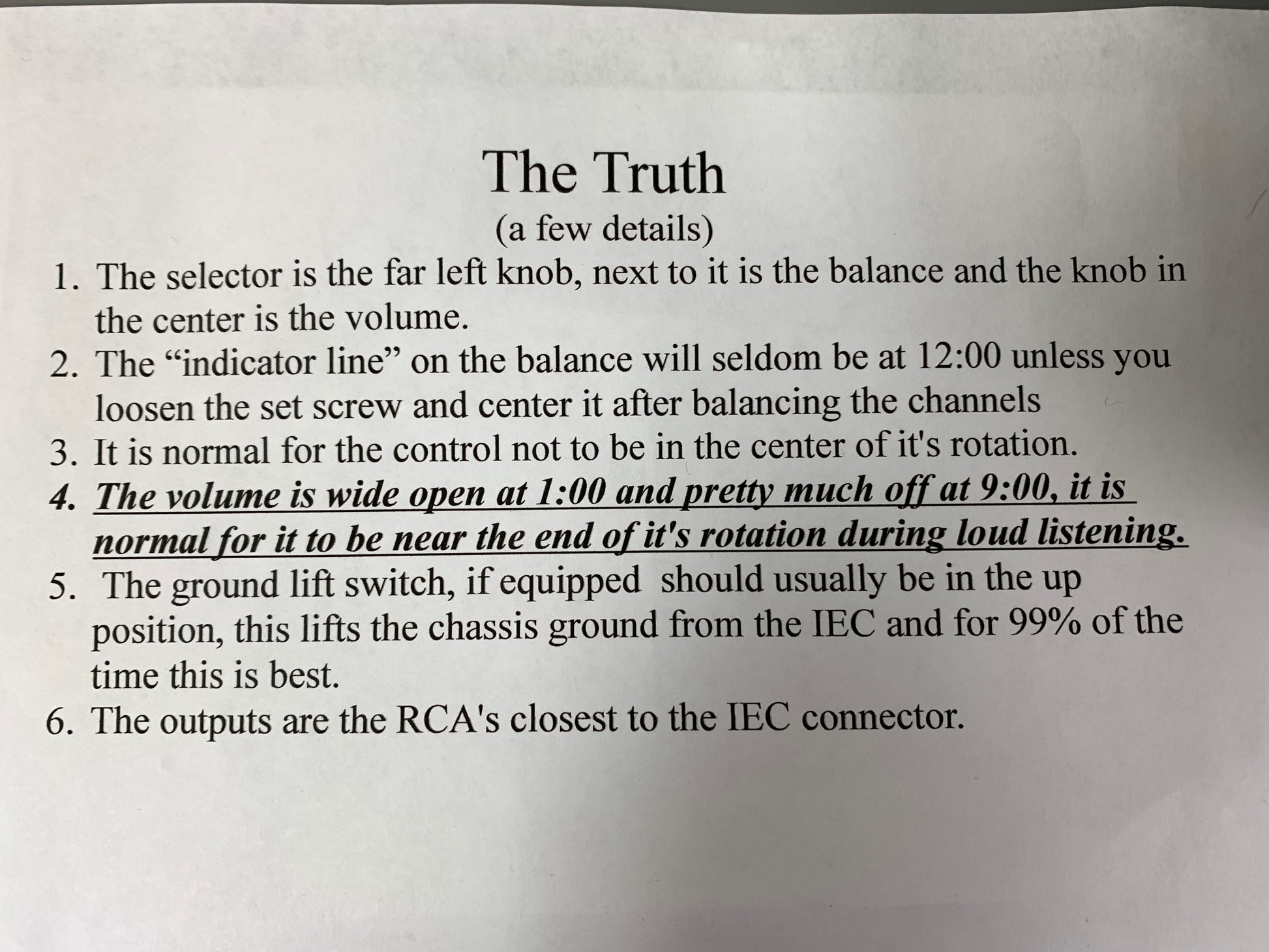 The Truth preamplifier is a line stage built by Ed Schilling of thehornshoppe. It is an active device that eliminates amplification and uses light to implement volume and balance control. The Truth uses input and output buffers to optimize impedance for the amplifier and source. It can handle low energy sources, power amplifier input requirements, and long signal cables.