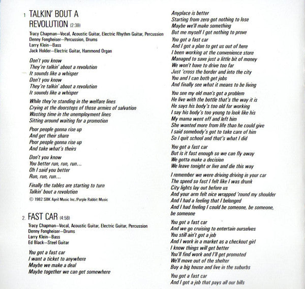 1. © 1982 SBK April Music Inc./Purple Rabbit Music 2. © 1987 SBK April Music Inc./Purple Rabbit Music 3. © 1985 SBK April Music Inc./Purple Rabbit Music 4. © 1983 SBK April Music Inc./Purple Rabbit Music 5. © 1982 SBK April Music Inc./Purple Rabbit Music 6. © 1987 SBK April Music Inc./Purple Rabbit Music 7. © 1986 SBK April Music Inc./Purple Rabbit Music 8. © 1986 SBK April Music Inc./Purple Rabbit Music 9. © 1983 SBK April Music Inc./Purple Rabbit Music 10. © 1986 SBK April Music Inc./Purple Rabbit Music 11. © 1986 SBK April Music Inc./Purple Rabbit Music All songs published by SBK April Music Inc. / Purple Rabbit Music, ASCAP Digitally recorded and mixed at Powertrax, Hollywood, CA Mastered at Masterdisk This Album is Decidated to Aneta Thanks to Mother, Rev. Tate, Jackie Green, Mark Fischer, Brian Koppelman, Charles Koppelman, Bob Kransow, and everyone at SBK and Elektra. Printed in U.S.A. Cat# 9 60774-2 On Spine / Cat# 60774-2 On CD and back page of booklet Full Digital Recording