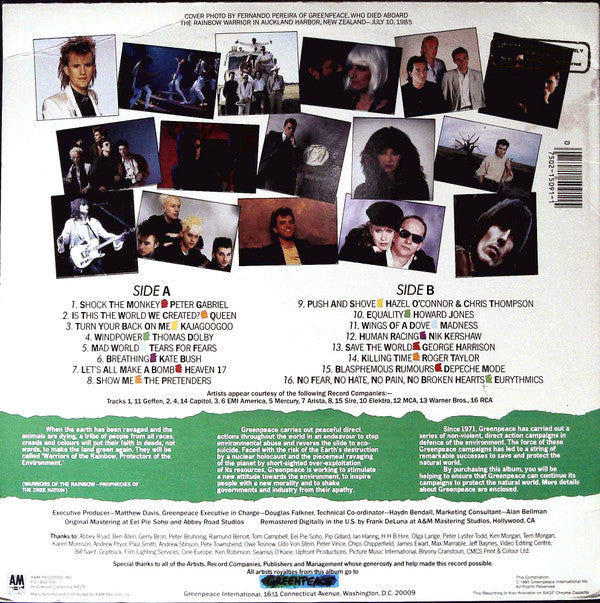"B" to the left of A&M logo on labels denotes an [l285745 pressing. Catalog # appears as SP 5091 on spine and as SP-5091 on label Some pressings are translucent (hold disc up to a bright light and you can see through it) Original Mastering at Eel Pie Soho and Abbey Road Studios Remastered Digitally in the U.S. at A&M Mastering Studios, Hollywood, CA ©1985 Greenpeace International Inc. A1 published by Cliofine Ltd. (ASCAP) ℗ 1983 The David Geffen Company A2 published by Queens Music Limited/Beechwood Music Corp. (BMI) ℗ 1984 Raincloud Productions Ltd. A3 published by Intersong Music (ASCAP) ℗ 1984 EMI Records Ltd. A4 published by Participation Music, Inc. (ASCAP) ℗ 1983 EMI Records Ltd. A5 published by Dick James Music Inc. (BMI) ℗ 1983 Phonogram Ltd. A6 published by Screen Gems-EMI Music Inc. (BMI) ℗ 1980 EMI Records Ltd. A7 published by Virgin Music Ltd. Admin. by Chappell Music/Sound Diagrams Admin. by WB Music Corp. (ASCAP) ℗ 1981 Virgin Records Ltd. A8 published by Hynde House of Hits/Clive Bands Music/ATV Music Corp. (BMI) ℗ 1982 Sire Records Co. B1 published by Albion Music Ltd. ℗ 1985 Greenpeace International Inc. B2 published by Warner-Tamerlane Pub. Corp. (BMI) ℗ 1984 WEA Records Ltd. B3 published by Nutty Sound Ltd./WB Music Corp. (ASCAP) ℗ 1983 The David Geffen Company B4 published by Irving Music Corp. (BMI) ℗ 1984 MCA Records, Inc. B5 published by Ganga Publishing B.V. (BMI) ℗ 1981 Dark Horse Records B6 published by Pink Pig Music (BMI) ℗ 1984 Raincloud Productions Ltd. B7 published by Emile Music (ASCAP) ℗ 1984 Sire Records Co. B8 published by Blue Network Music (ASCAP) ℗ 1983 RCA Ltd. [a11136 and [a10388 appear courtesy of [l821 [a81013, [a24046 and [a208268 appear courtesy of [l654 [a99929 and [a85929 appear courtesy of [l5761 [a19814 appears courtesy of [l39357 [a12340 appears courtesy of [l362 [a197435 and [a2725 appear courtesy of [l27031 [a40360 appears courtesy of [l651 [a5647 appears courtesy of [l878 [a243955 appears courtesy of [l1000 [a13911 appear courtesy of [l895