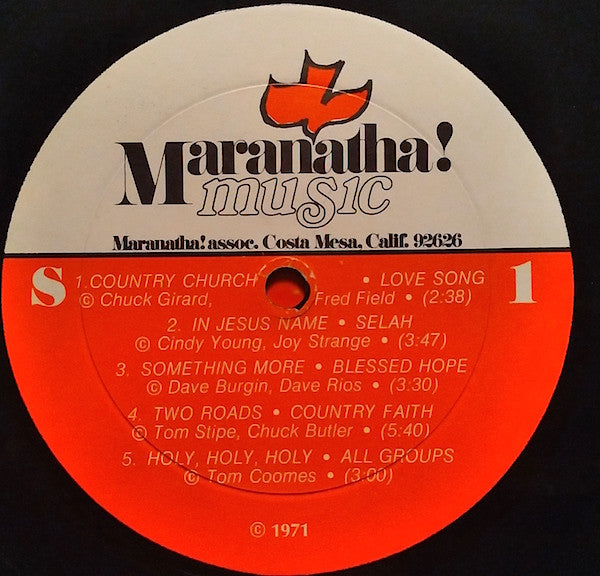 Also known as "Maranatha! 1" as it is the first in the numbered Maranatha! series Anonymously produced by Chuck Girard First pressing has Costa Mesa address printed on custom white & red label, no address printed on back cover & "STEREO HS-777/1" in lower left corner of front cover Second pressing has Costa Mesa address printed on custom white & red label and on back cover & "STEREO HS-777/1" in upper right corner of front cover Third pressing has Irvine address printed on custom white & red label, Costa Mesa address printed on back cover & "STEREO HS-777/1 RETAIL $4.98" in upper right corner of front cover Fourth pressing has Irvine address printed on standard beige label with maroon print, Irvine address printed on back cover & "STEREO HS-777/1 RETAIL $4.98" in upper right cover of front cover Fifth pressing has Irvine address printed on standard beige label with black print, Irvine address printed on back cover & "STEREO HS-777/1 RETAIL $4.98" in upper right cover of front cover Sixth pressing has Irvine address printed on standard beige label with black print, Irvine address printed on back cover & "STEREO HS-777/1" in upper right cover of front cover